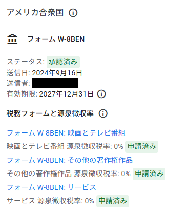 👉 税務情報(W-8BEN)が正しく提出されていること